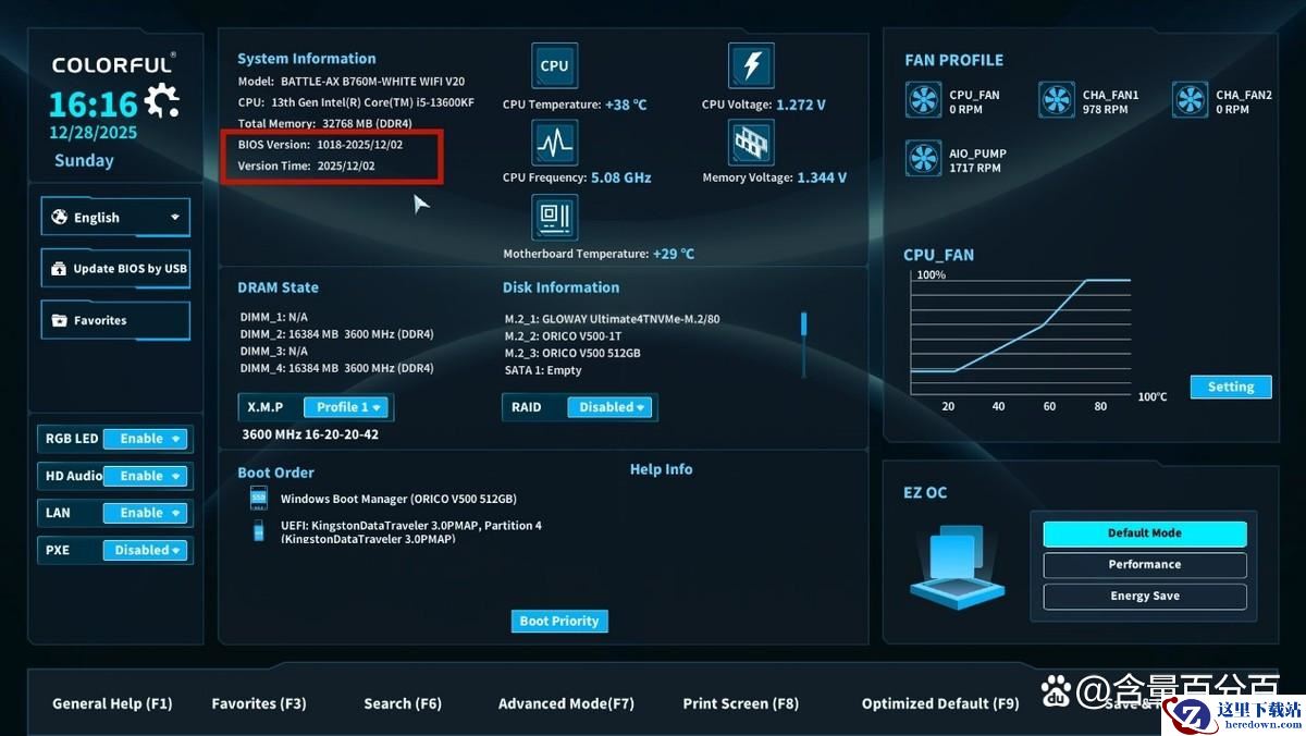 搭配测试的主板BIOS是目前最新的1018,这一版本主要就是更新了全新的UI界面。需要留意的是,由于此版本更新变动较大,需要我们手动在UEFI DOS环境下进行更新。