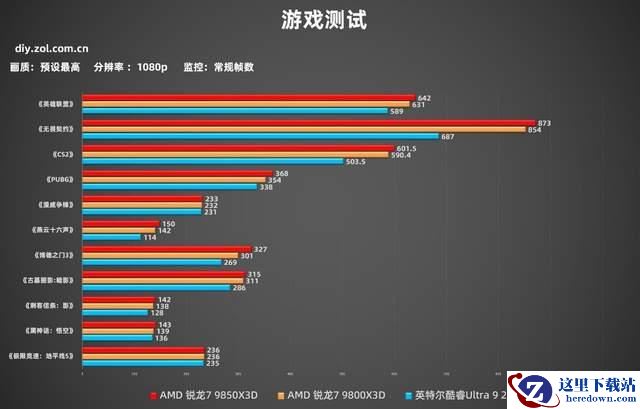 AMD 锐龙7 9850X3D作为专门针对游戏玩家推出的处理器,我们首先进行了游戏测试,本次测试我们选择了《英雄联盟》、《无畏契约》、《CS2》、《PUBG》、《漫威争锋》、《燕云十六声》、《极限竞速:地平线5》、《黑神话:悟空》、《刺客信条:影》、《古墓丽影:暗影》、《博德之门3》这11款游戏进行测试,测试分辨率为1080p、2K、4K,画质预设最高,使用游戏自带benchmark以及游戏加加进行帧数监控。首先我们来看一下常规游戏帧数测试。