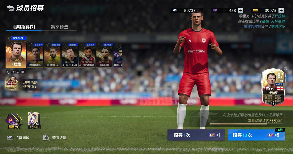 9月14日-9月20日,「永不独行」限时卡池开启,最多550抽,经理们就能招募到94潜力中后卫卡拉格,让您的球队拥有坚不可摧的后防线。