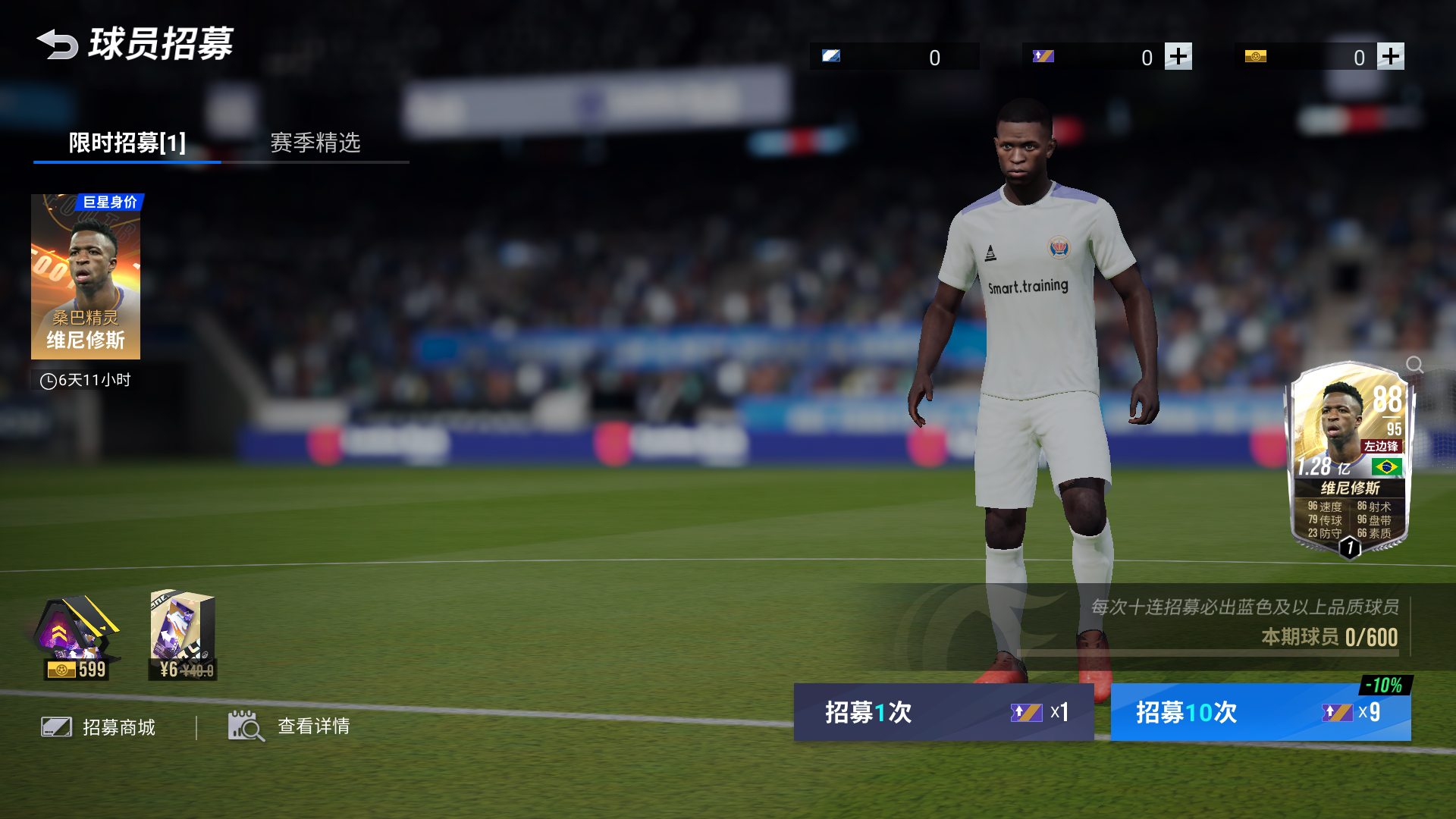9月18日-9月24日,「桑巴精灵」限时卡池开启,最多600抽,就能将95潜力左边锋维尼修斯收入麾下,让您的球队实力再上一层。