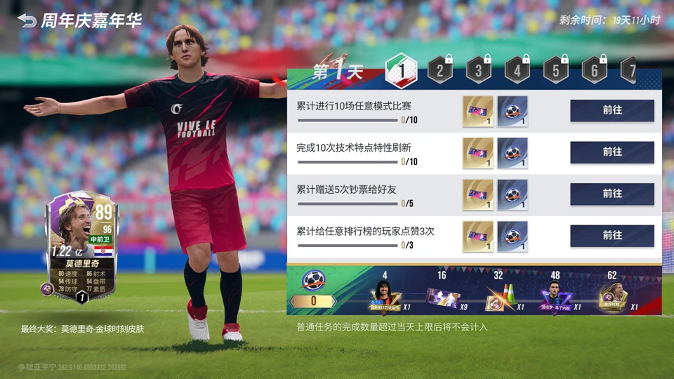 9月21日-10月10日,玩家可通过完成每日的嘉年华任务,获得对应的道具奖励。当活跃度满足指定条件后,更可领取「古利特7日体验卡」、「莫德里奇-金球时刻」赛季时刻等大量奖励。