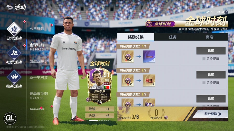 9月21日-9月30日,金球时刻收集活动开启,活动期间经理收集指定球员(古利特、罗纳尔迪尼奥、罗纳尔多、梅西等球员)的「金球时刻」赛季时刻或赛季时刻片段可获得金球积分,使用金球积分可兑换丰厚奖励,大奖为「金球时刻」珍稀称号。