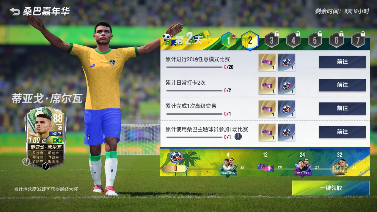 7月8日-7月17日活动期间,玩家可以通过完成当天的嘉年华任务,获得对应的道具奖励;当活跃度满足指定条件后,更可领取包括【蒂亚戈·席尔瓦-国家象征】、【91+潜力球员包】等豪华奖励!