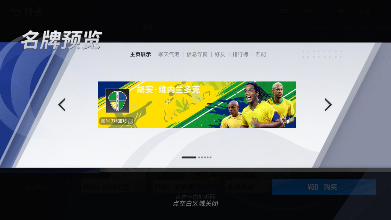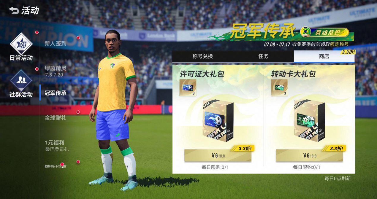 7月8日-7月17日活动期间,玩家收集齐罗纳尔迪尼奥、蒂亚戈席尔瓦、内马尔和卡洛斯的国家象征赛季时刻,即可获得限定称号“舞动桑巴”,且每收集一个赛季时刻可领取一份阶段奖励!活动期间同时开放每日任务及商店,玩家完成每日任务即可领取对应奖励,前往商店可以超高折扣购买许可证大礼包及转动卡大礼包,每日限购一次!