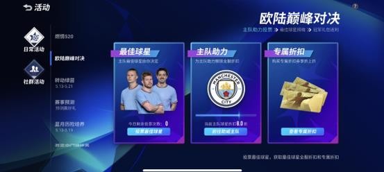 此外,游戏近期还上线了【欧陆巅峰对决】活动。玩家可选择晋级欧战决赛的任一队伍,并为其中支持的某位球星加油助威。当个人支持度达标,即可解锁一定天数的限时球员礼包。全服支持度达标后,对应主队的球星专属助威礼包将会解锁一定折扣!快来为自己支持的球星投票吧!如果该球星在2支球队中票数分别排名前2(共4名),其专属助威礼包(若夺冠将返还一定比例点券)将上架商城。而活动期间,玩家还可以购买对决助威卡,享球星专属助威礼包折上折!