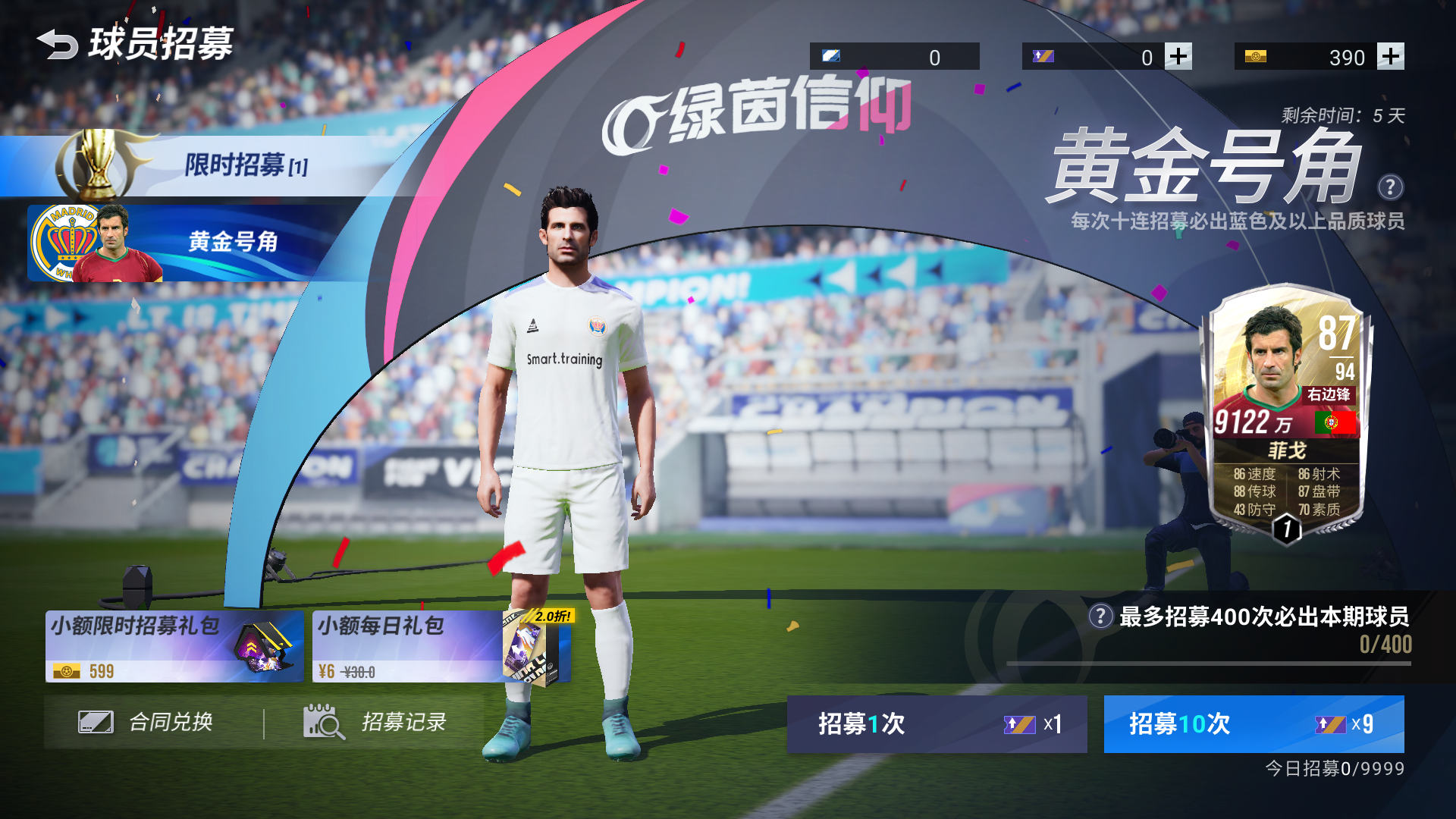5月13日-5月19日,还会开启【黄金号角-菲戈】专属招募卡池,最多400次限时招募必得传奇球星菲戈。作为世界级中场球星,那个年代的绝对巨星,菲戈球风朴实,没有花哨的动作,但教科书级的控球技术出神入化。