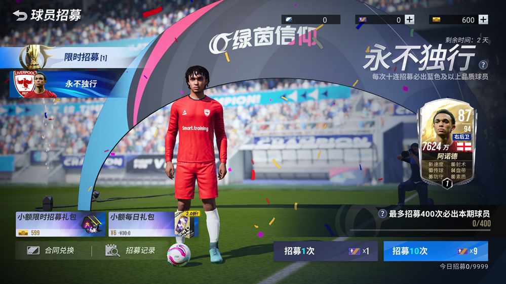除了毕业中场马克莱莱,近期还有2个限时招募卡池开启。 5月6日-5月12日,开启的是【永不独行-阿诺德】专属招募卡池,最多只需400次限时招募必将招募到全能型边后卫阿诺德!5月7日-5月13日,【三狮队长-凯恩】专属招募卡池开启,最多只需400次限时招募必将招募到凯恩!以上招募卡池的招募进度,将会继承大家此前在其他限时招募卡池的招募进度。