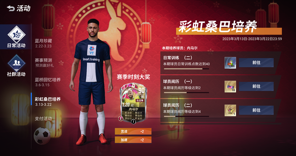 3月13日-3月22日,【彩虹桑巴-内马尔专属招募卡池】限时开放!内马尔是巴西足球天才,11岁加入桑托斯俱乐部,19岁就斩获南美足球先生称号。他技术精湛、盘带出众、突破犀利,他的带球过人,销魂而耀眼,能在球场上编织出美妙彩虹!在《绿茵信仰》中,双5脚五星花式,再加上游戏内第二高的盘带属性,使得内马尔的操作手感极为丝滑。而且内马尔拥有着非常可观的速度和射门属性,能突能带能传能射,可以说是球队前场不可或缺的多面手!