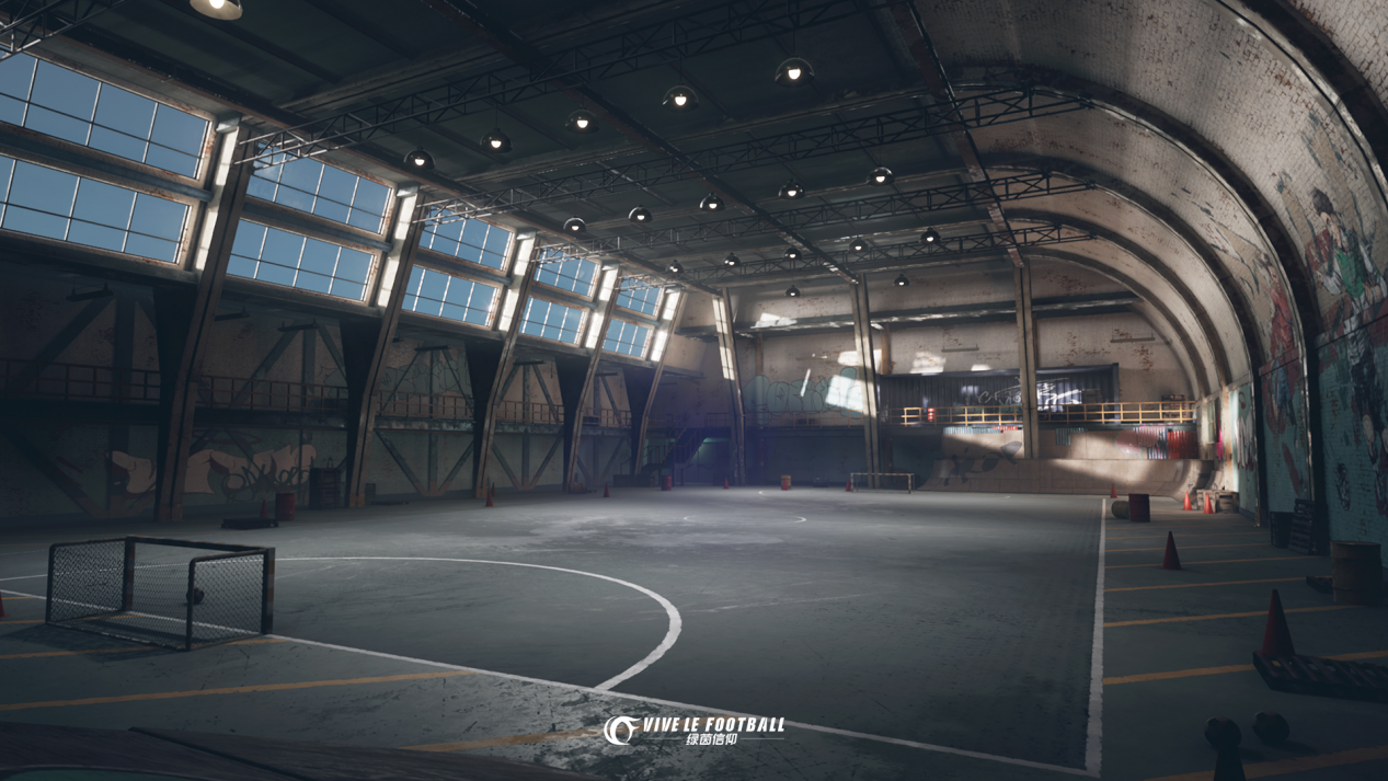 除此之外,备受大家喜爱的3V3街球模式也将有所提升,今日曝光的精致场景壁纸,更能看出《绿茵信仰》对街球模式的投入和用心。设立在空旷的废旧厂房里街球赛场,水泥场地略显粗糙,顶棚大灯密集排开,巨大的联排玻璃窗洒下温暖斑驳的阳光,照耀着厂房墙壁上各种涂鸦,充满钢铁质感并透出另类的艺术气息,给人别具一格的感觉。在这样风格明显的球场上挥汗,是不是让你更有一种野性和粗犷的感觉,不禁热血沸腾呢?