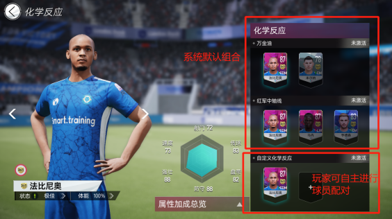 另一方面,「化学反应」界面也进行了设计迭代,除了让界面跟美观实用,最主要是增加了「化学反应」中的“自定义化学反应”功能。通过自定义功能,球员的化学反应将在系统默认组合之外,增加更多的可能性。自主进行球员配对,组成新的自定义化学反应,将能更灵活构建你的球队,适应更多的赛场情况。