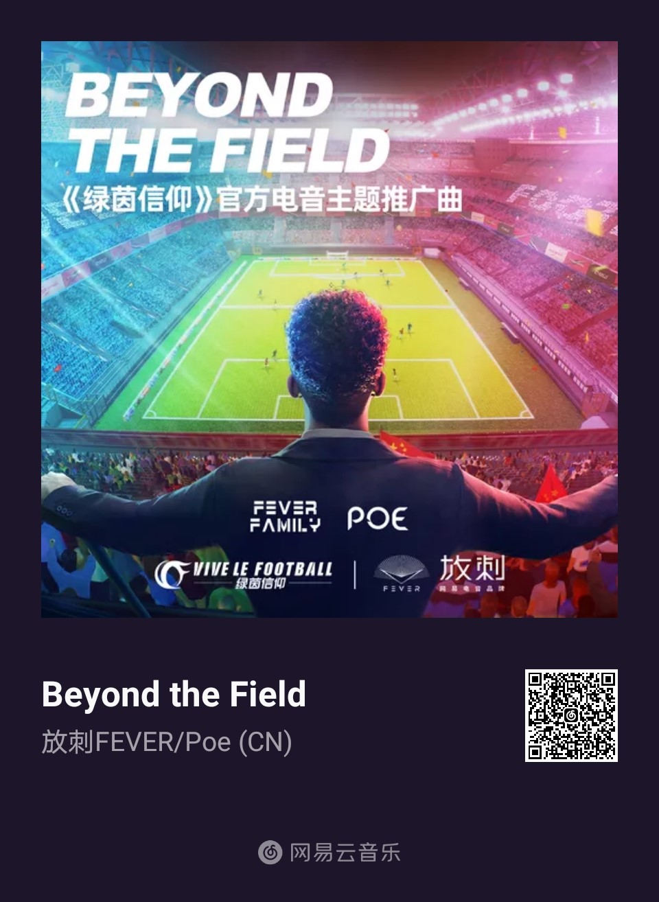 在观赛派对上首度亮相的《Beyond the Field》,作为《绿茵信仰》的电音主题曲,是由网易电音品牌放刺FEVER,携手旗下FEVER FAMILY实力制作人POE,亲力打造。主题曲的创作灵感上,为描绘绿茵场上的激情,传递对绿茵的信仰与热爱,选择使用电子舞曲中的Uplifting Trance框架,通过快速澎湃的节拍去更好体现赛场的激情。而在主题曲的律动处理上,还融合了一些拉美舞曲的风格元素,增添了热情的人文色彩。