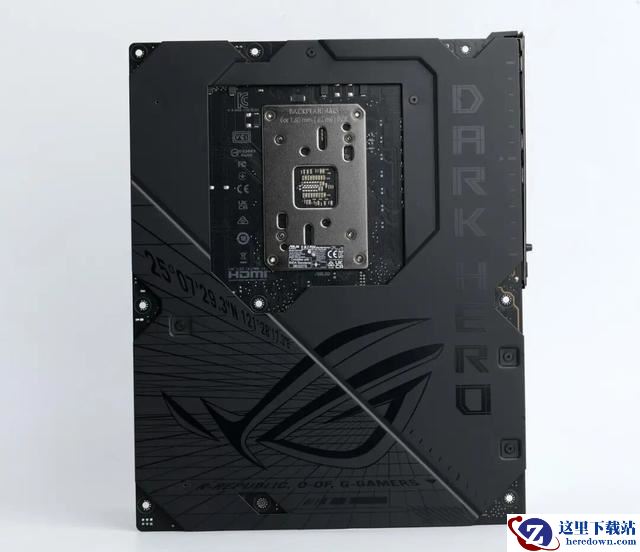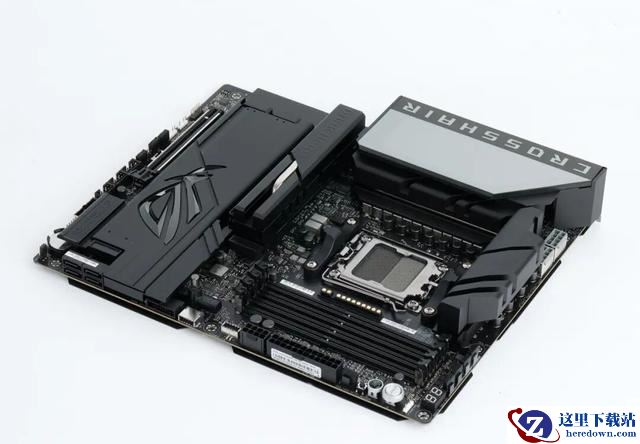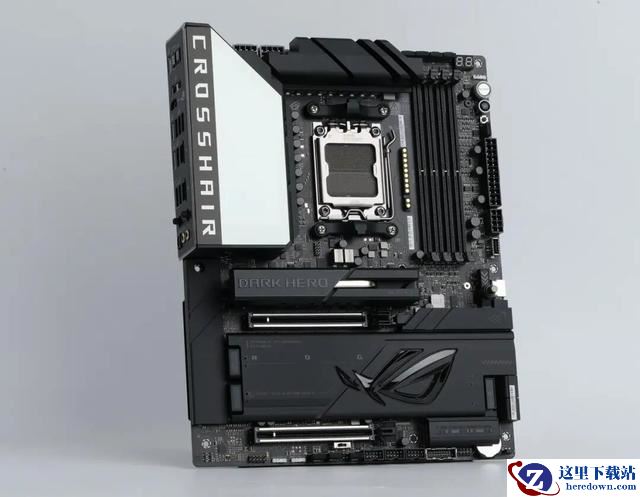 为充分释放新处理器锐龙7 9850X3D的最大性能,本次我们特别搭配ROG专为AMD高性能处理器研发的新品——ROG CROSSHAIR X870E DARK HERO主板。顾名思义,作为DARK HERO,它以纯黑为主色调,搭配细腻的磨砂质感,部分区域辅以低调的金属暗纹点缀,整体视觉效果沉稳且富有质感。大面积的一体化黑色散热装甲覆盖了供电区、M.2插槽和芯片组,装甲表面采用了拉丝与纹理切割工艺,兼具散热性能与视觉冲击力。