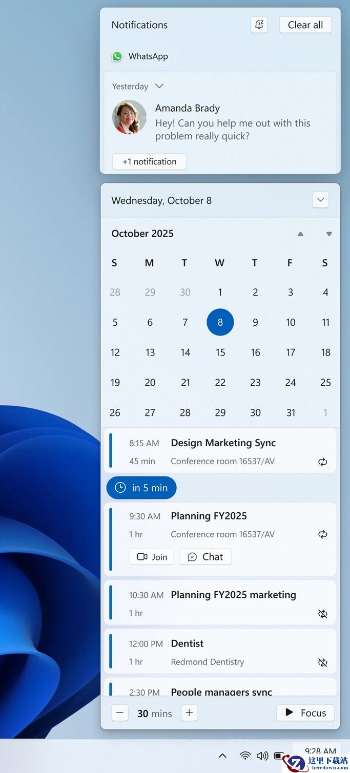 系统组件方面,微软为了提升生产力体验,计划在 Windows 11 通知中心重新引入 Windows 10 时代的“日程视图”(Agenda View),支持直接查看 Outlook 日程安排。