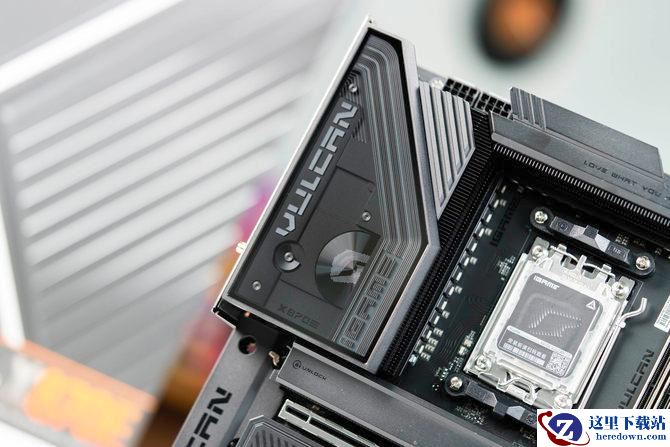 七彩虹X870E火神主板作为七彩虹当家旗舰版型,整体的外观通体采用黑色,给人第 一眼的感觉就是酷炫。这次主板延续了七彩虹火神家族的赛博电竞风格,正面基本上做到了全金属散热装甲的覆盖,并且还有非常多“VULCAN”的元素加入,视觉体验非常惊艳。
