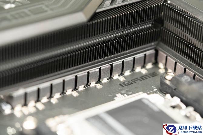 主板的VRM供电装甲上,这次采用了“智械视窗”的设计,机械元素配合上透明的视窗设计,还有贯穿式的灯光效果,点亮之后的视觉体验非常出色,电竞感十足。