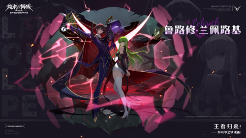“王者归来!——奏响零之镇魂曲!”说到《Code Geass 叛逆的鲁路修》,首先想到的当属黑色骑士团的统领,带着神秘面具的“ZERO”鲁路修·兰佩路基了!在动漫的世界中,这位拥有着被称之为Geass(契约)的特殊能力的人,将在终末的世界中怎样去贯彻黑色骑士团的信念?一切谜题将在游戏联动版本开启后揭晓!