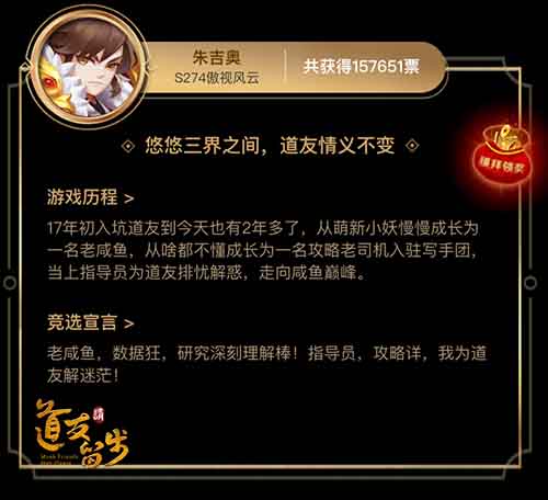 人气第一的玩家代言人叫“朱吉奥”,他有着两年道友游戏经验。刚玩游戏的时候,他还是一名什么都不懂的小萌新,而现在已经是一名攻略大神。这位代言人的竞选宣言是:“老咸鱼,数据狂,研究深刻理解棒!指导员,攻略详,我为道友解迷茫!”