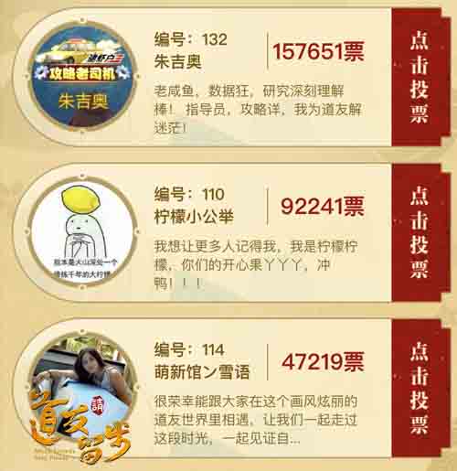 在“玩家代言人”活动中,64名道友玩家晋级海选,进入最终投票环节。在经过数日投票活动后,“玩家代言人”结果终于出炉:三名玩家脱颖而出,成为玩家代言人。
