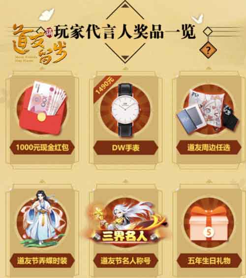 成为“玩家代言人”不仅可以载誉而归,还能获得海量奖励:千元现金、道友周边任选、道友节名人称号、游戏礼包……丰富的奖励让代言人拿到手软。