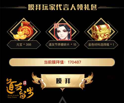 “玩家代言人”奖项现已揭晓,没有上榜的玩家也有福利!现在前往【道友请留步】公众号号膜拜代言人,可以领取游戏礼包。礼包内有388元宝、道友节弄蝶碎片、金色材料箱等好礼!