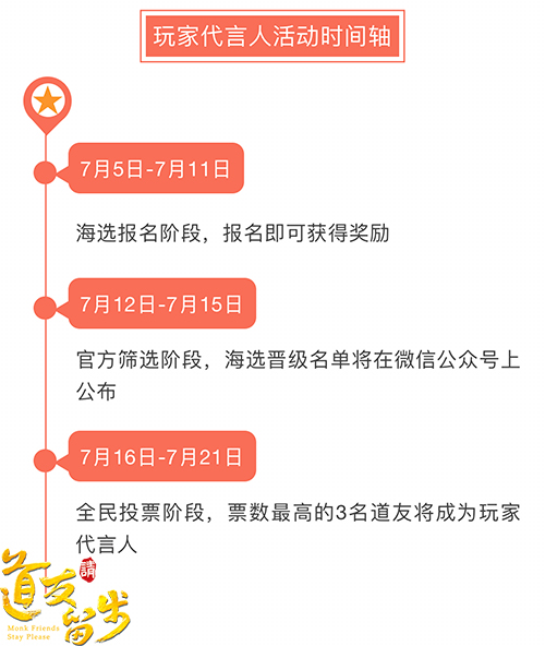 本次玩家代言人征集将一共经历三个阶段,7月5日至7月11日为海选报名阶段,报名即可获得奖励。7月12日至7月15日为官方筛选阶段,海选晋级名单将通过《道友请留步》微信公众号进行公布。7月16日至7月21日则为全民票选阶段,票数最高的三位玩家将成为代言人