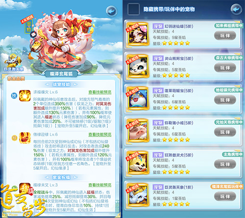 在本次资料片中,万众瞩目的紫金神宠“福泽玄尾狐”终于正式实装,有着三界第一美少女之称的小狐狸可不仅仅是颜值高,更有着超强的战宠技能和紫金宠物专属的祝福技能哟!小狐狸作为发放福利的“招财小天使”,其技能特征也是“发福利”,史上最强BUFF“延福”不仅减免伤害、抵御减怒,还能加成攻击!除此之外,万人迷小狐狸更有玩伴系统,能够召集其他宠物成为玩伴为全体上阵神仙提供属性加成!