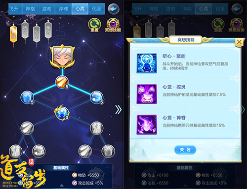 在本次版本更新之后,可以说《道友请留步》正式踏入了全民紫金时代,紫金神仙的培养和战力提升逐渐成为大部分玩家关注的焦点。本次更新开放了紫金神仙特有的养成系统“心斋”。每位神仙的心斋能力将由养成树的形式构成,玩家可以根据自己的需求进行配置。当神仙完成指定修炼之后则会有机会获得额外的冥想技能。