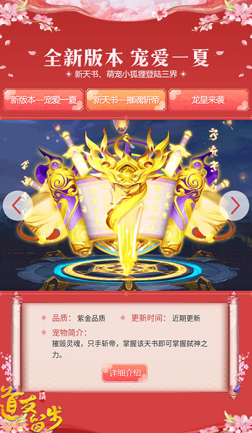 除了更新最高品质的紫金神宠之外,本次“宠爱一夏”版本还将更新最高品质的天书——催魂斩帝书。超级霸气的名字自然也以为至高无上的战力!摧毁灵魂,只手斩帝,掌握这本天书即可掌握弑神之力,三界诸神、十方妖魔莫不俯首称臣!