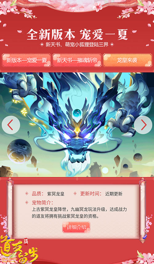 首先,本次“宠爱一夏”新版本中最值得期待的当然就是三界第一美少女终于要降临啦!就连《道友请留步》官方网站都因为这位美少女的降临而变成粉红色了。这位美少女全名叫做“福泽玄尾狐”,顾名思义就是为大家发福利的小狐狸!但是,不要以为小狐狸外表可爱就好欺负哟,身为最高品质的紫金神宠,她的实力也是不容忽视的,诸位道友不妨到游戏内一探究竟!