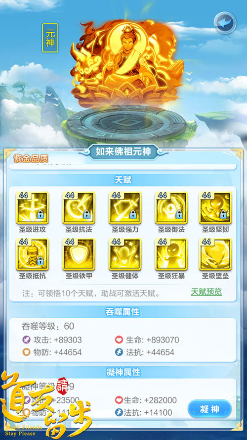 当然,再多的比例加成都是建立在基础属性之上,基础属性越高、比例加成的威力才会越明显。如何提高神仙的基础属性,除了常规的升级、进阶之外,元神系统也是不容忽视的一条路。而紫金元神,相对于其他品质的元神,额外具备了“凝神”功能,其成长上限更高,所能提供的属性加成自然也就越多了。