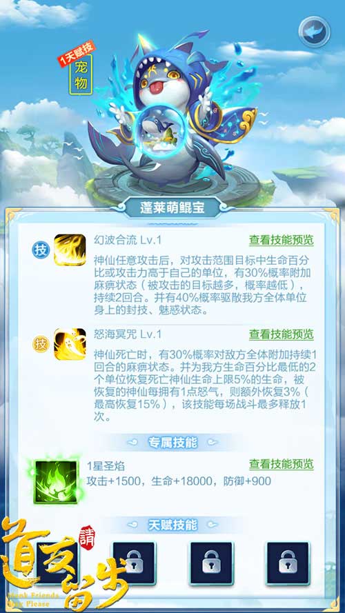《道友请留步》曝光的第二只金宠,其名曰“蓬莱萌鲲宝”。比起尸鲲的霸气、骨鲲的高冷,同样身为北冥一鲲,蓬莱萌鲲宝则是秉持着“萌即是正义”的精神诞生啦!但是既然身为高品质的金色宠物,鲲宝当然不会“中看不中用”。鲲宝的专属战宠技能“幻波合流”和“怒海冥咒”可以说是PVP战斗中的神技。一方面能为自家神仙解封、加血、回怒。另一方面则可以给对方施加强力DEBUFF“麻痹”。真可谓是一箭双雕哇!