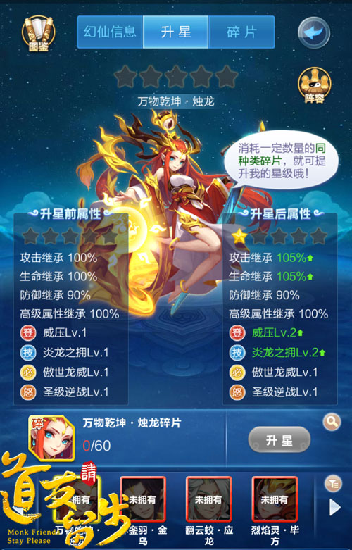 那么,幻仙的存在究竟会给《道友请留步》的玩法带来哪些新的变化呢?首先,在阵容界面中,玩家可以选择给不同的上阵神仙搭配不同的守护幻仙。幻仙上阵守护后,基础属性和高级属性将按照一定百分比完全继承于所守护的神仙。正所谓男女搭配,干活不累,为英俊帅气、君临天下的霸者黄帝搭配热情似火、执掌乾坤的烛龙,说不定会产生一招制敌的奇效。