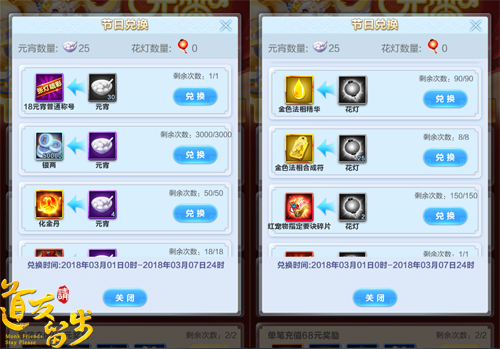 元宵节期间(3月1日至3月6日),玩家登录《道友请留步》即可领取大量金元宝和元宵大礼包,元宵大礼包中可以随机开出特级锻造石、紫色灵武精华等多种稀有升级材料。除了登录好礼之外,单笔充值达到一定金额还将额外获得丰厚的单充大礼包,金色法相精华、红色法宝碎片免费附赠。