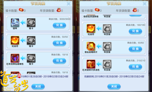 活动期间,玩家无论是参与金仙贺岁专题活动,还是完成日常任务,都有机会获得福卡及年货袋。收集福卡和年货袋可以在节日兑换道具商店中换取红色神仙魂魄碎片、红色灵武碎片等多种奖励。年前最后一波强势福利,赶紧给你的超强力神仙卡牌送点年货吧!