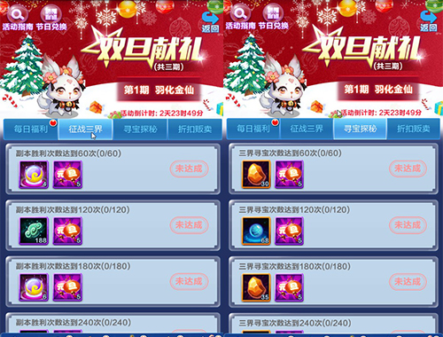 寻宝探秘和征战副本是道友们修仙证道的岁月中,每天都要进行的事情。在双旦活动中,道友只要寻宝探秘和征战副本达到一定的次数,道友们就可以获得大量的养成材料等。还能获得双旦限时活动道具-元旦灯笼用以兑换红仙升金仙必备的升金丹,金卡近在咫尺,美滋滋哇。