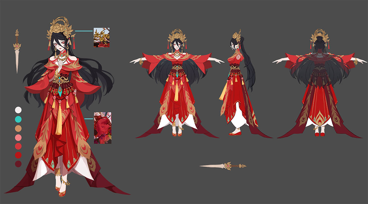 形象设计上,绯衣一袭红色嫁衣,红色的眼睛,下面是带血的眼泪,充满怨气的眼神,仿佛在诅咒一切,锋利的匕首散发着诡异的光芒,浑身上下充满了对复仇的渴望。