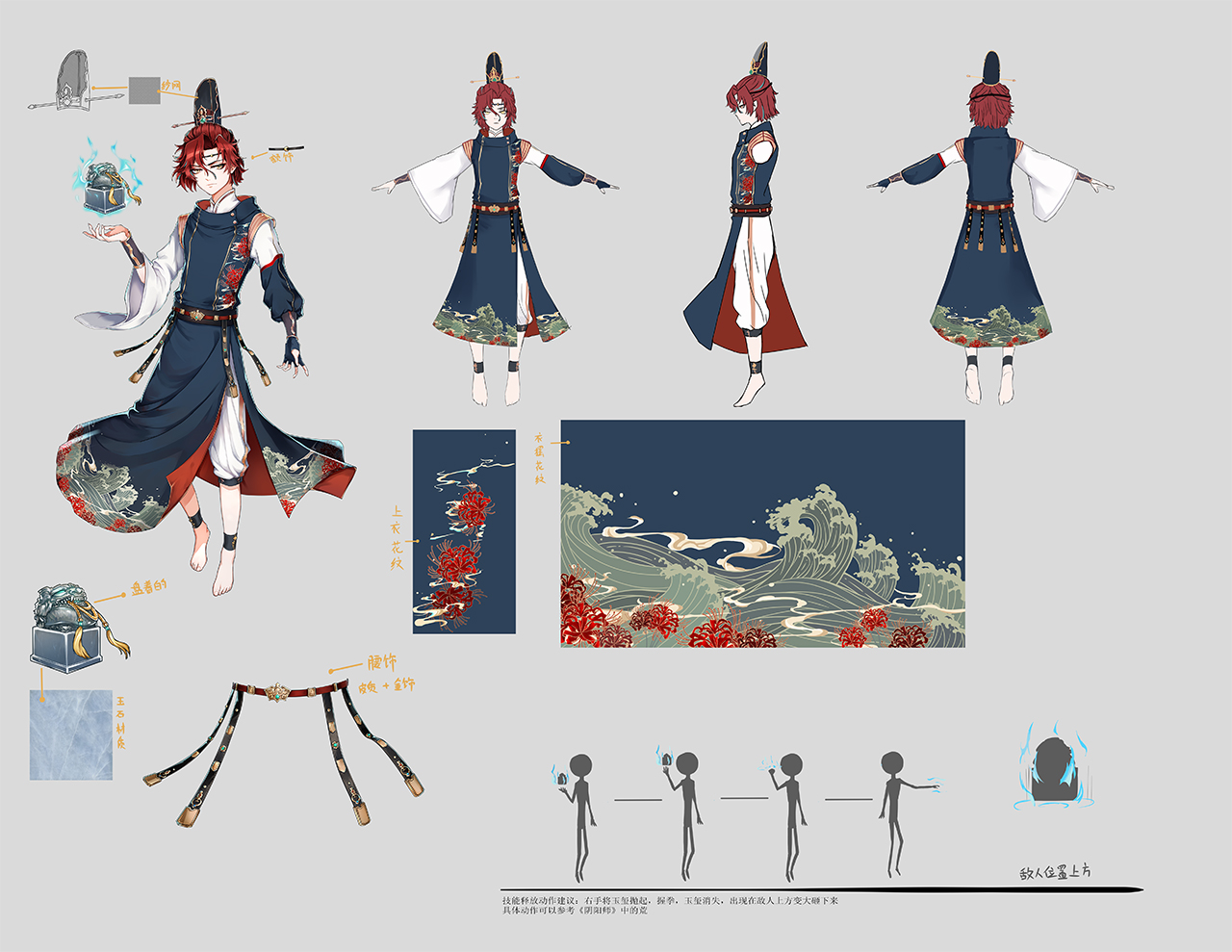 海水江崖纹是中国古代官服的一种传统纹样,阎罗的服饰也加入了此纹路,下摆部分还加入了彼岸花的元素,统帅众鬼差,接引亡魂通往地狱。