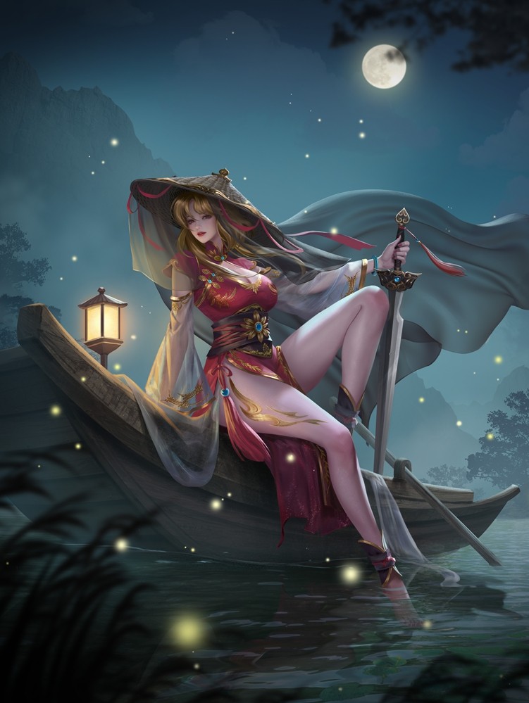 她斜倚船舷,足尖探入水中,搅碎满天星河。