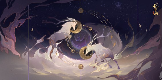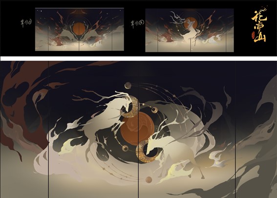 最终他们选择将原双鹿图使用的主色 "绢纨"换成“香炉紫烟”、“紫菂”、“拂紫绵”、“三公子”等多种紫色。101工作室的美术们根据画面的每一个部分所代表的意向来细细调节其中紫色表现,在表达轻盈感觉的云彩上就使用了最浅的“香炉紫烟色”,而由星月相映的涡浪则使用了自古以来就代表权威和尊贵的“三公子色”。