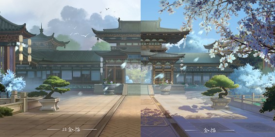 如果我们将《花亦山心之月》的背景画面进行放大,我们会发现画面中的建筑整体都有金描装饰,走廊上的浮雕、瓦缝间的反光都运用了描金装饰。尽管这些场景细节在手机上是几乎看不清的,但项目组还是坚持选择对每一个细节进行了刻画以此来保证整个画面的生命力。