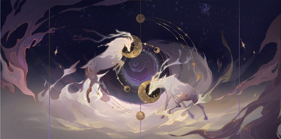 对传统色彩的运用让团队找到了属于《花亦山心之月》的独特色彩体系,以双鹿图为例,一件官窑瓷器“紫色钧窑盘”帮助成员们找到了理想中古贵与梦幻结合的色调。因此在创作过程中,在轻盈的云彩上使用了最浅的“香炉紫烟色”,最中心的旋涡使用了代表权威和尊贵的“三公子色”。