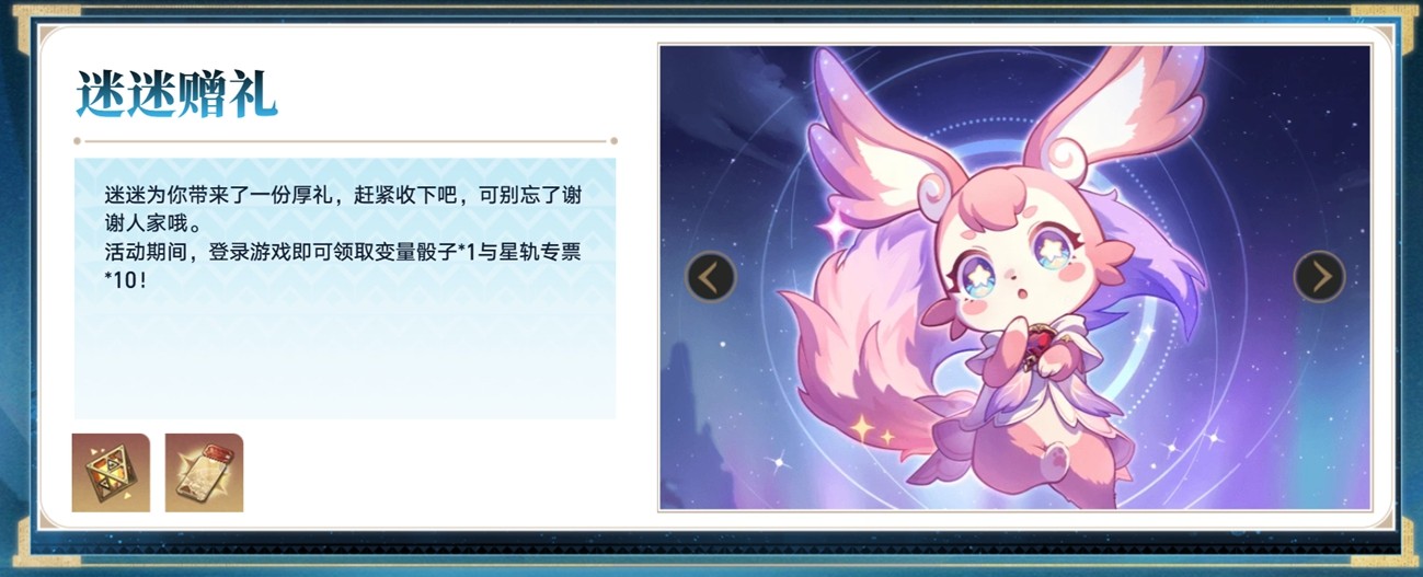1月15日版本更新后,不仅有签到7天获取的10张「星轨专票」以外,还可额外获得迷迷为开拓者一次性带来的「星轨专票」*10和「变量骰子」。为开拓者前往新星球增添助力。