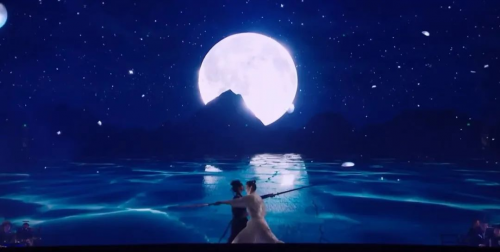 在皎洁的月光下,镜流的部分是由两位身着黑、白颜色服饰的演员共同完成的,通过让黑服饰的“镜流”蒙眼,白服饰的“镜流”蒙面,来代表镜流身上的分裂人格;乐曲进入高潮,镜流那标志性的“照彻万川”镜头搭配哀恸凄婉的小提琴旋律,她的心境也一一纤毫毕现,更是让观众完全沉浸到《剑出无回》这首曲子的情绪当中。