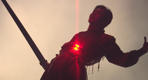 紧接着便是“刃”的部分,场上灯光昏暗,除了位居正中的演员外,台上的种种交锋均被光柱与光幕所代替。而当红色的光柱“击中”了演员的胸膛时,“刃”邪魅、疯癫的一面便彻底得到了释放,激昂的唢呐、狂乱的剑舞相得映彰,让人不由得回想起其在角色PV中的近乎完全一致的表现……