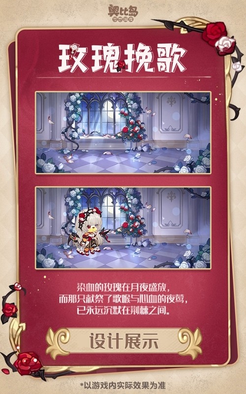奥比生活新系列「荆棘玫瑰套装」「夜莺绝唱套装」、「绯羽誓约发夹」「玫瑰荆棘系带」「玫瑰荆棘挎包」系列散件、「荆棘玫瑰亭桥」「夜莺玫瑰花」家具以及「玫瑰挽歌」背景卡已于今日上线。本期还有奥比生活塔罗系列装扮返场,本期生活达到一定等级即可获得「月涟幻梦套装」「灵魂审判套装」的购买资格,喜欢的奥比不要错过!
