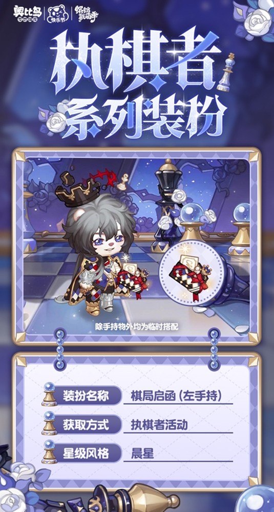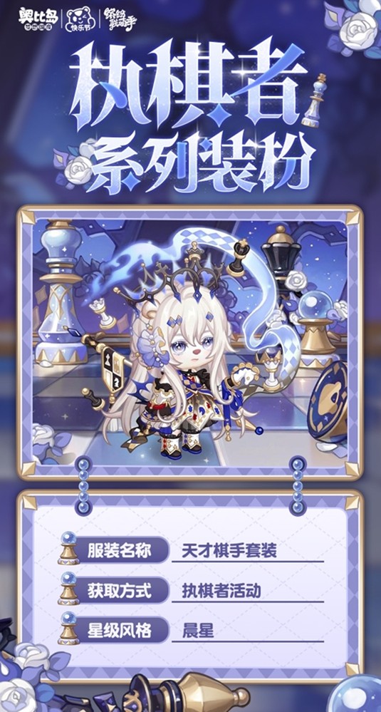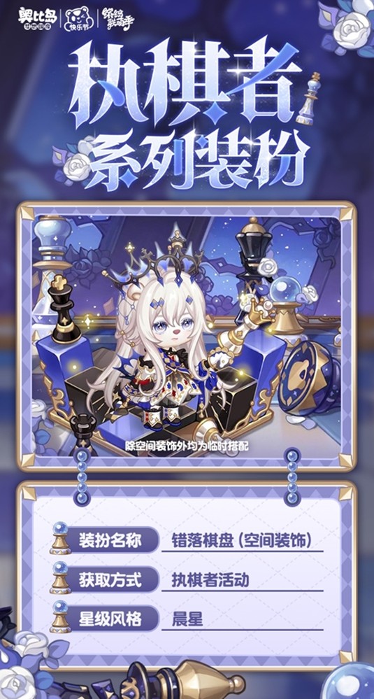 9月30日5:00-10月29日23:59期间,参与「执棋者」限时活动,可获得活动限定奖励。奖励包括:辉月房型「黑白棋境别墅」,晨星装扮「天才棋手套装」「棋局心魔套装」,典藏装扮「时律裁定套装」「源自核芯套装」,晨星装扮「棋局启函」、「错落棋盘」,还有主题限定家具「王棋城堡系列」「时棋之家系列」、双人坐垫「熊熊棋盘」、幻光「棋子足迹」、头像框「待启之弈」、背景卡「星弈残局」等惊喜礼物!