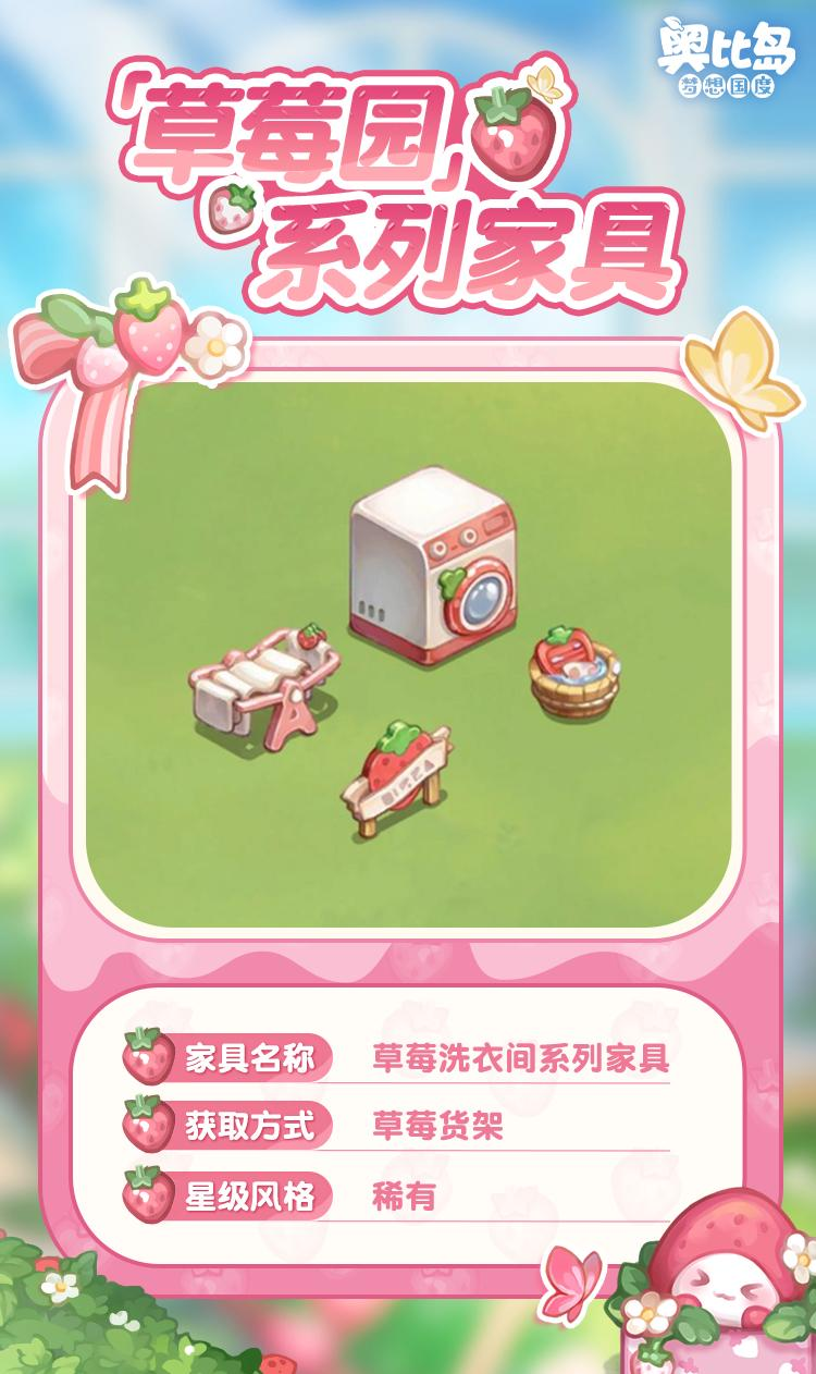 参与「草莓园」限时活动,收集订单小票,生成合成物品并提交,可获得道具「草莓牛奶」。「草莓牛奶」可在「草莓货架」免费兑换「甜莓连衣裙」「草莓园小白鹅」「红彤彤草莓发夹」「清新草莓叶发箍」等装扮,以及「草莓洗衣机」「草莓搓衣盆」「草莓丰收小车」「草莓采果木梯」等家具!好礼多多,甜蜜好礼多多,小奥比们快快行动起来!