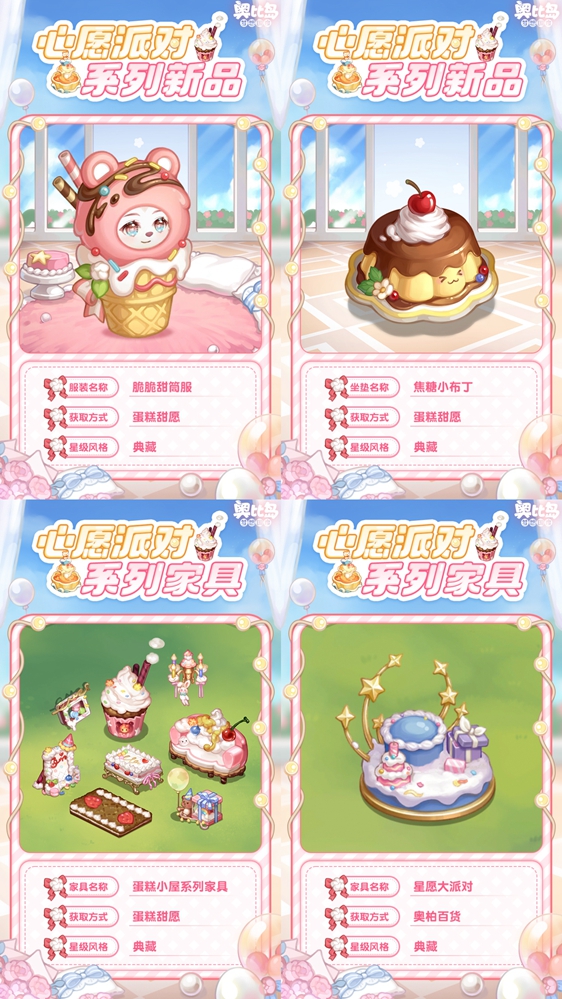 小奥比们在「心愿派」活动收集“派对帽”,就可免费兑换「蛋糕连体衣」「趣味蛋糕眼镜」「缤纷生日灯牌」「摇摆节奏头箍」「啪叽蛋糕帽」等装扮,以及「礼物盒小凳」「礼物盒小熊」「礼物盒小惊喜」「蛋糕店小栅栏」等家具,完成「蛋糕礼奉」活动,还有稀有家具「心意奶油喷泉」免费领取!