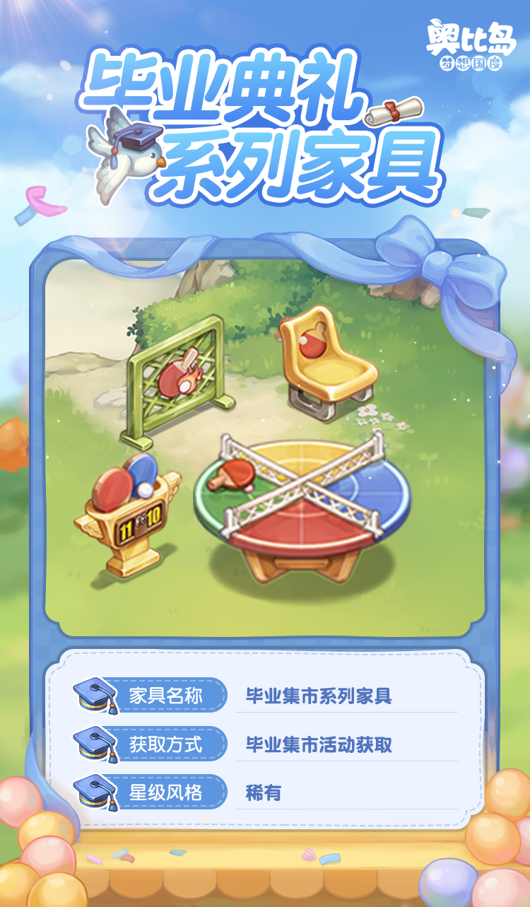 小奥比们在「毕业季」活动收集“校园纪念币”,就可免费兑换「猫咪吐司头套」「喵喵计算器」「毕业快乐帽」「毕业小礼袍」等装扮,以及「乒乓球比分板」「乒乓球观众小椅」「乒乓球彩色桌」等家具,诸多限定好礼,小奥比们别错过!