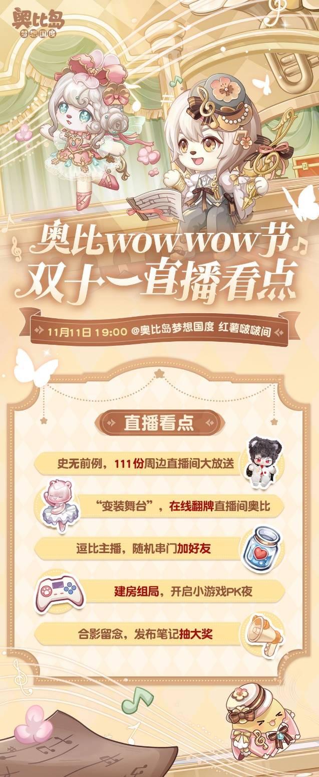 本场直播超多互动环节:奥比岛手游虚拟主播奶油咖啡在线翻牌小奥比,互换衣橱玩转“变装舞台”新玩法;还有主播建房组局小游戏大比拼,欢迎小奥比们前来挑战;固定环节——“奥比大合照”。